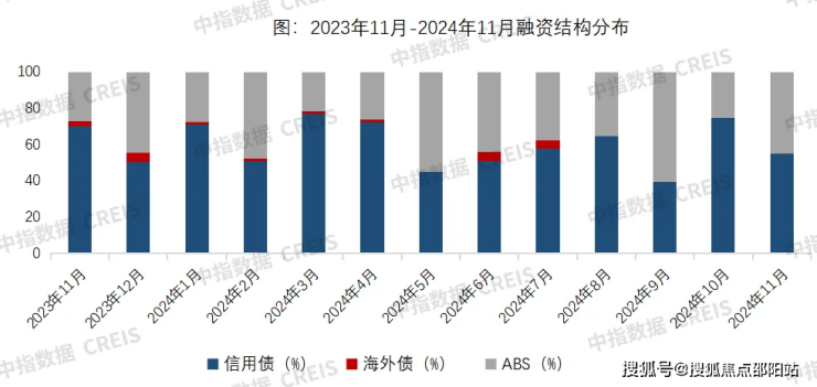 从融资结构来看,11月,房地产行业信用债融资266.6亿元,同比下降14.4%,环比增长22.8%,占比55.2%;ABS融资216.2亿元,同比增长81.2%,环比增长197.2%,占比44.8%。