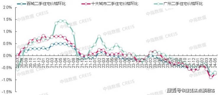 图:2020年7月至2024年5月百城、十大城市及广州二手住宅价格环比走势对比数据来源:中指数据CREIS(点击查看)市场监测:https://www.cih-index.com/