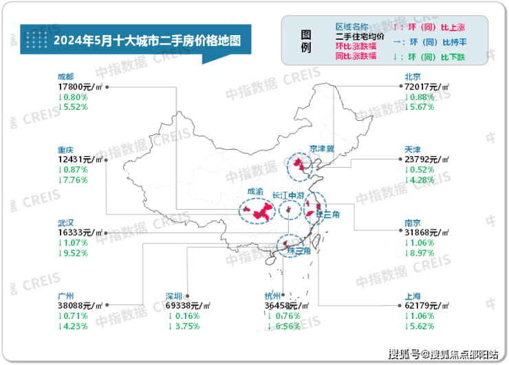 根据中国房地产指数系统百城价格指数,2024年5月,百城二手住宅均价环比下跌0.70%,跌幅较4月收窄0.05个百分点;同比下跌5.80%,跌幅较4月扩大0.42个百分点。5月,十大城市二手住宅均价环比下跌0.75%,跌幅较4月收窄0.14个百分点;同比下跌5.70%,跌幅较4月扩大0.60个百分点。