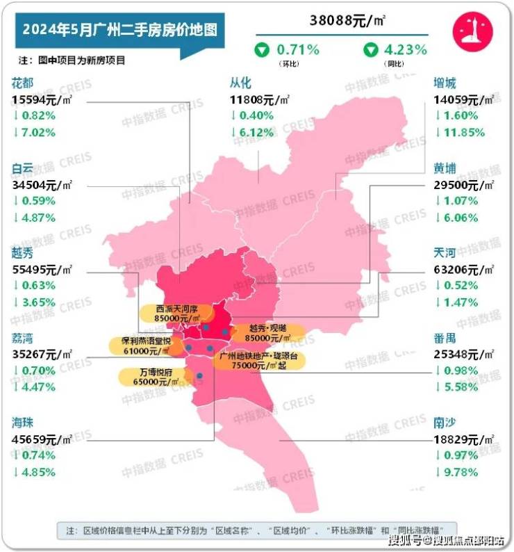 图:2024年5月广州各市辖区二手住宅挂牌均价及环同比数据来源:中指数据CREIS(点击查看)市场监测:https://www.cih-index.com/