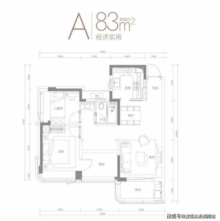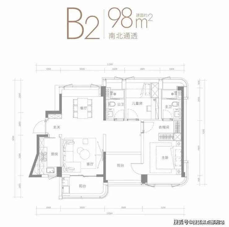 约98㎡户型,南北通透,南向采光面达到11.5米,除了承重墙部分外,都做成了阳台和飘窗,连两个卫生间都有一整面的飘窗,做到室内全明。主卧也是南北向布局,起居舒适度很好。