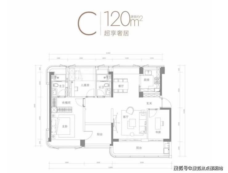 约120㎡户型,玄关处多一间房,跟客厅共享6.2米阔景阳台。这个空间可以做成书房或者娱乐室,工作休闲都有一处安静的空间。还能跟客厅打通,还形成一个开间6.2米的超大横厅。主卧套房尺度达到约3.4米*4.6米,带步入式衣帽间和独立卫生间。