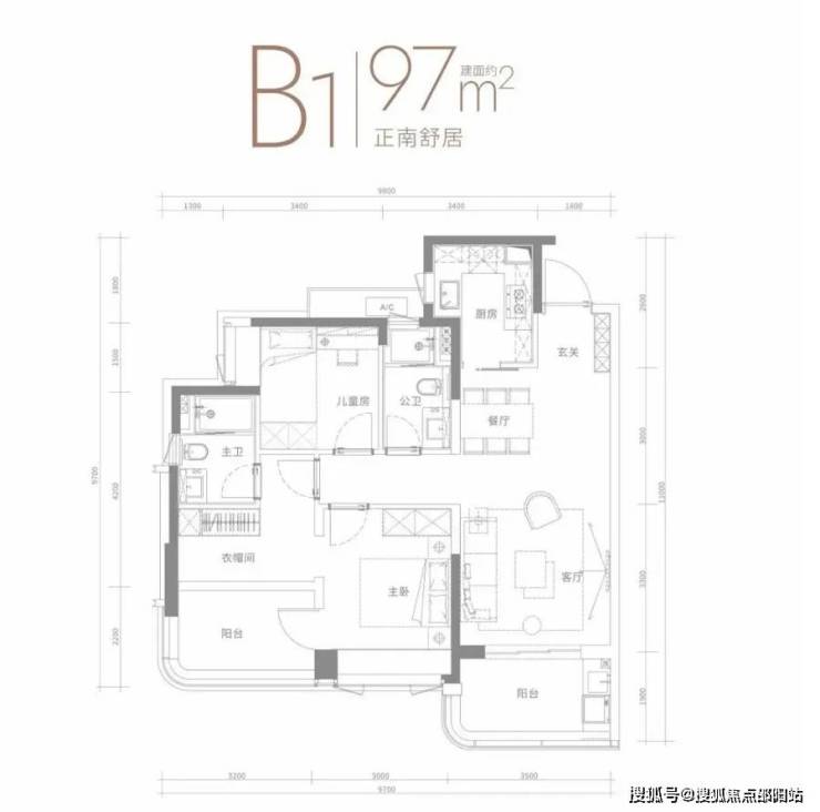 约97㎡户型,三面采光,南向采光面达到9.7米,次卧拥有L型飘窗,270°的采光面。主卧套房设计,带独立卫生间私密空间。