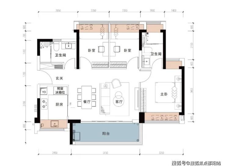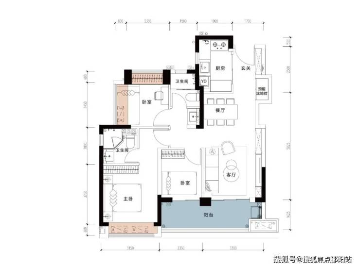 此户型虽为两个卧室,但带有三大飘窗,更加巧妙的是,预留了LDKB一体化设计空间,更好的延伸室内空间,冰箱位置外移,释放厨房空间,小户型也有大空间的享法。