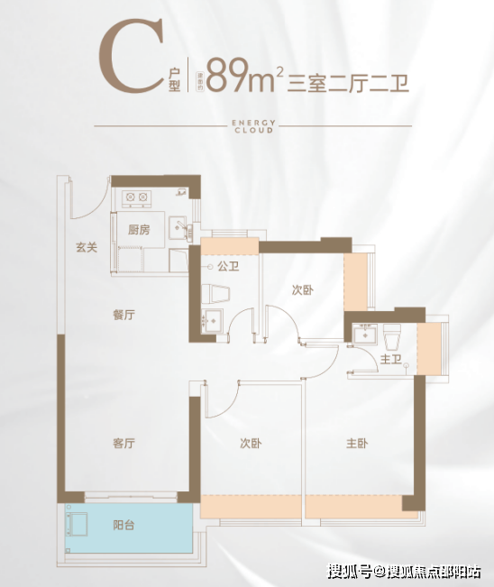 84㎡三房户型,格局跟89㎡的差不多,但跟市场上产品比,同等面积做到了少有的2卫。