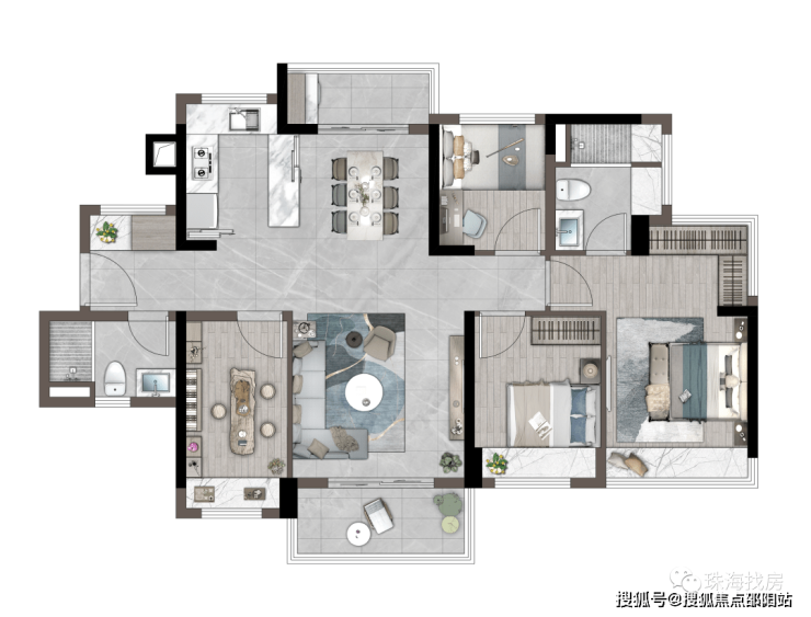 萃取地道岭南风韵,经典岭南审美简约呈现,传统造园手法与现代园林技术结合,首创新岭南主义风格;近9米架空层,保障通风凉爽舒适;南偏东/西33度角,取得最佳通风采光效果;点式阵列布局,将法线错开,最大化景观视野和楼距空间。