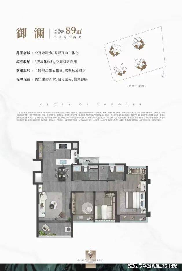 户型面积布局289平三房两厅两卫设计的是新版竖厅格局,客厅开间3.5米,LDKB一体化,S墙设计预留冰箱位,约11米四面宽超幕视野,主卧套房带衣帽间,U型全开敞厨房,得房率:78.99%(不含赠送),有西北、西南、东北、东南4个朝向。