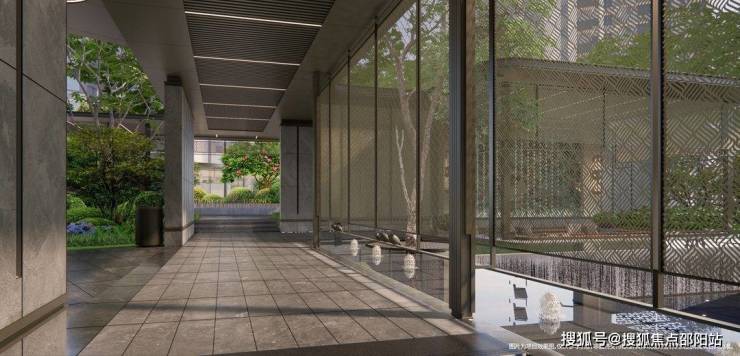 以灯带、镂空格栅顶以及御湖水纹,打造了风雨连廊,在保障无雨归家的同时,设计师通过与水借景,与光借景,与园林借景,带给业主归家的第三道礼序。