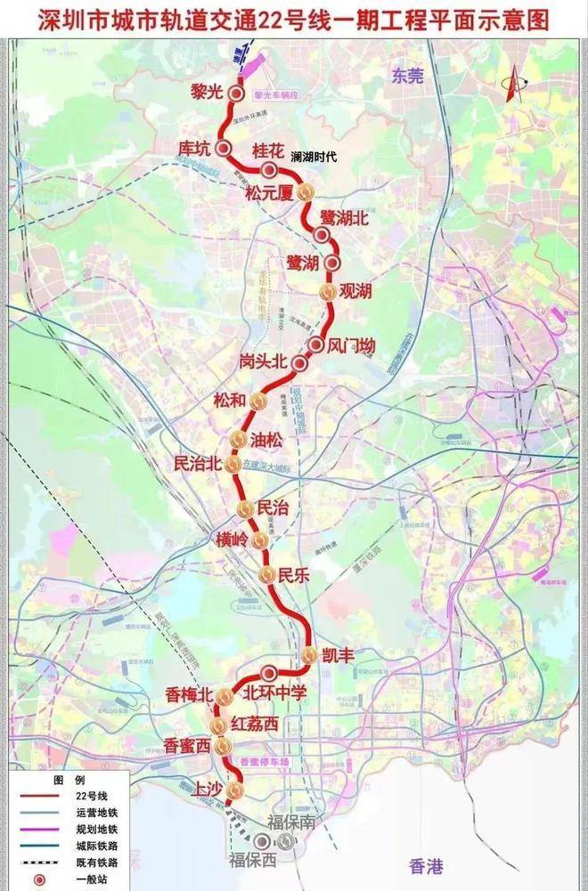 22号地铁线在2024年1月份正式动工,大概2028年年底完工;总投资近400亿元,该线路起自福田上沙,途经龙岗区,止至龙华区黎光站,预留向北延伸至东莞的条件。线路全长34.7公里,设站21座(换乘站13座),设计时速100公里。