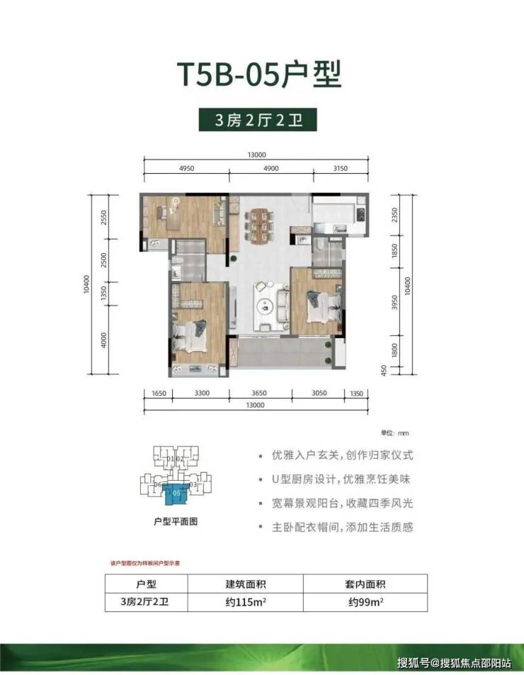 :3 房 2 厅 2 卫,建筑面积约 115m²,套内面积约 99m²。优雅入户玄关,U 型厨房设计,宽幕景观阳台,主卧还配有衣帽间,提升生活质感。
