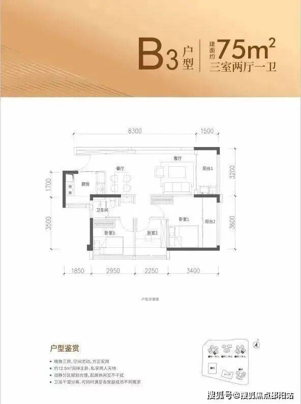 75㎡的3房2厅1卫,设计的是竖厅格局,客厅3.2米开间,进深8.3米,LDKB一体化设计,3个卧室分别做到了主卧13.24㎡/次卧8.85㎡/次卧6.75㎡(包含墙体飘窗),U型厨房,卫生间三段式分离,得房率约91%(包含赠送),东南朝向。