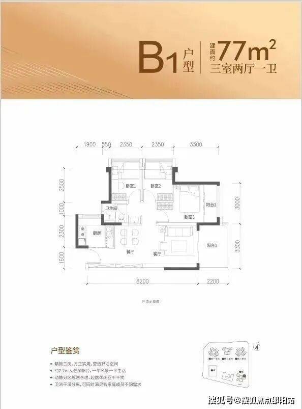77㎡的3房2厅1卫,设计的是竖厅格局,客厅3.3米开间,进深8.2米,LDKB一体化设计,3个卧室分别做到了主卧11.3㎡/次卧7.28㎡/次卧7.28㎡(包含墙体飘窗),U型厨房,卫生间三段式分离,得房率约88.31%(包含赠送),东南朝向。