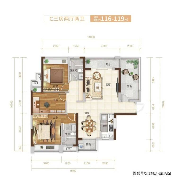 C户型:116-119㎡三房两厅两卫
