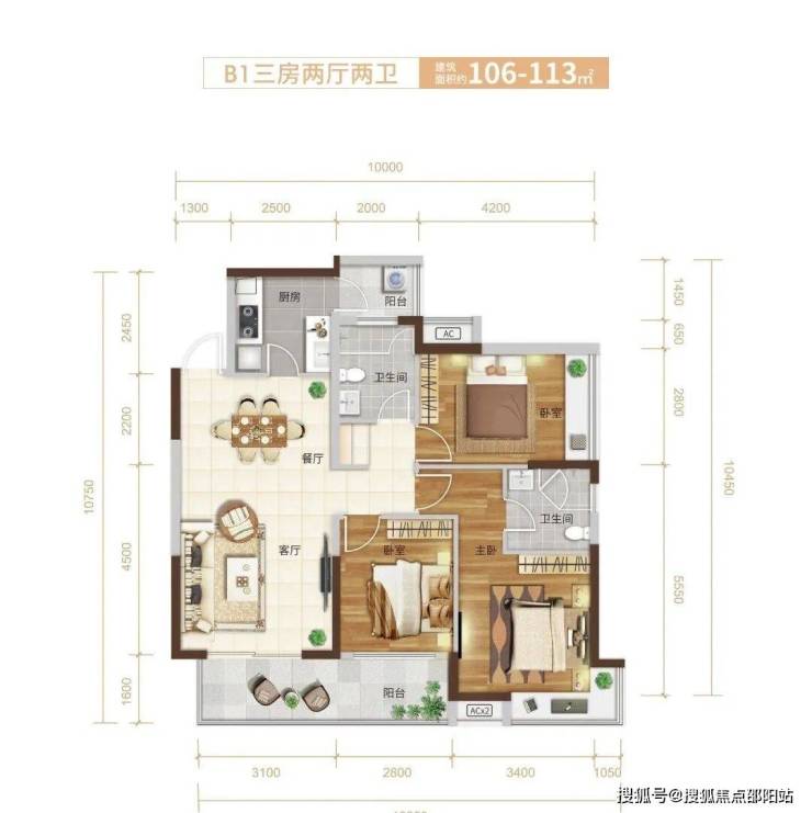 B1户型:106-113㎡三房两厅两卫