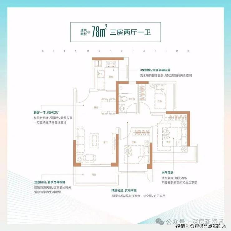 78㎡的3房2厅1卫,设计的是经典竖厅格局,客厅3.4米开间,三开间朝南,主卧270°转角飘窗,分别做到了主卧9.21㎡/次卧8.65㎡/次卧6.52㎡(实测面积,去掉墙体),得房率:74.71%(不含赠送),西南或东北朝向。套内面积58.44㎡+赠送面积8.87㎡=实得67.31㎡,实际得房率86.08%。