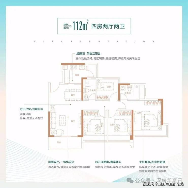 112㎡的4房2厅2卫,设计的是经典竖厅格局,客厅3.9米开间,四开间朝南,主卧270°转角飘窗,分别做到了主卧16.52㎡/次卧10.03㎡/次卧9.21㎡/次卧5.93㎡(实测面积,去掉墙体)厨房还带1个生活阳台,得房率:77.39%(不含赠送),东南朝向。套内面积87.74㎡+赠送面积11.48㎡=实得99.22㎡,实际得房率87.41%