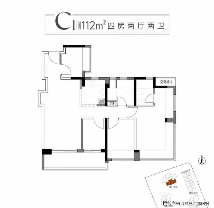 112m²的4房2厅2卫,C1户型,设计的是经典竖厅格局,LDKB一体化,S墙设计预留冰箱卡槽位,动静分区,四开间朝南,U型厨房,卫生间干湿分离,得房率95-101%(包含赠送),东南朝向看小区园林景观。主卧270度转角无柱飘窗+1个次卧在入户玄关位置,适合做办公室