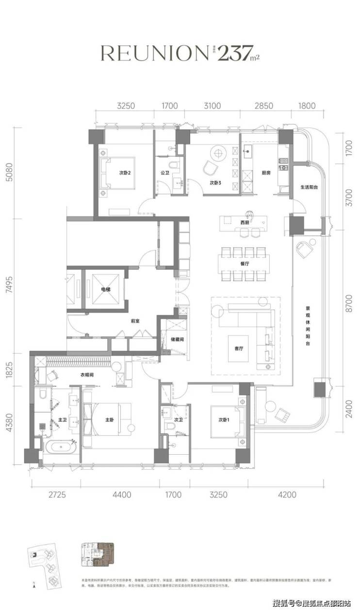 237㎡户型:60㎡超大客厅+31㎡L型转角阳台,双主卧套房设计;
