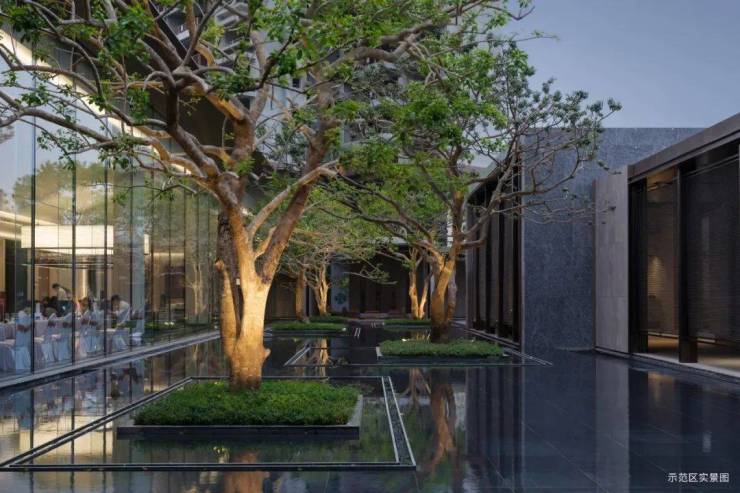 在松湖润府的造园理念里,雅致的园林不只是户外空间与自然景观的简单并列,它应该是二者共存,互相深入的对话空间。为了不辜负松湖烟雨这至美盛景,松湖润府秉持在地性原则,以“臻藏山水 东方雅院”为设计理念,提取松山湖自然景观元素,构建“双环三园七院”层进式诗意园林,打造“临松湖又见松湖”的生活第三重宽境。
