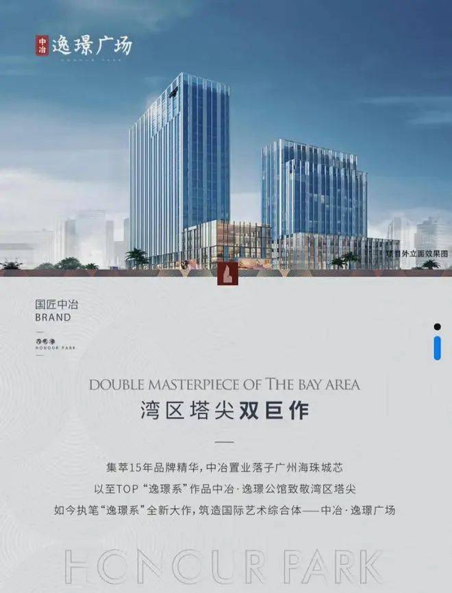广州中冶·逸璟广场(别名:中冶名捷广场、万宝地块项目)位于海珠区宝岗大道与江燕路交界处,由世界500强企业中冶集团打造,总建筑面积7.45万㎡。项目拥有两栋国际理念建筑和三层下沉式公园购物广场,周边四地铁环绕,交通便利,生活配套醇熟。主力户型为30-76㎡的双钥匙或LOFT,装修标准为豪装8000元/㎡,是广州城芯的低总价投资优选。