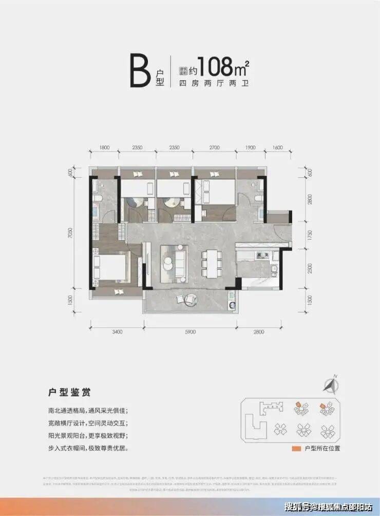 108㎡户型做的是横厅,动静分区,四房两厅一厨两卫一阳台的格局,这种户型最近几年非常常见了,优点就是横厅显得客厅更宽,有宽景阳台,室内通透性略好一些。