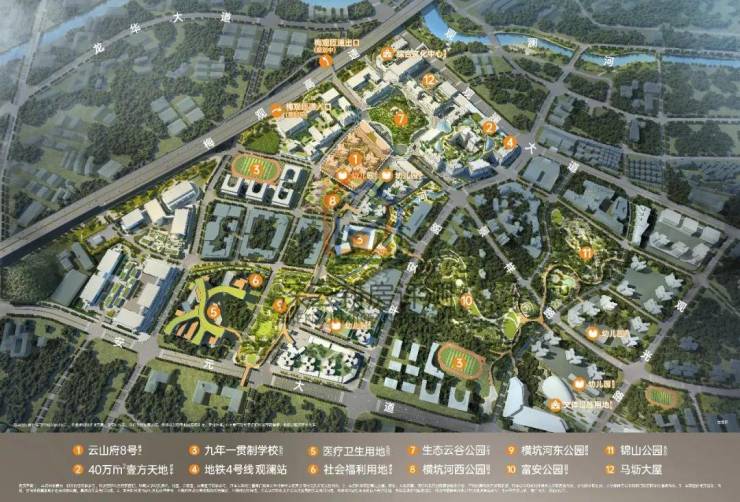 项目规划有5大城市公园,体量超23公顷,包括生态云谷公园、横坑河西公园等。