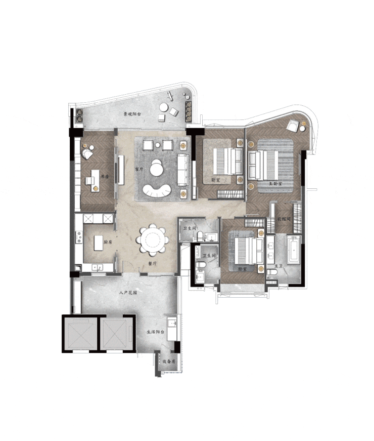 設計師用“平鋪的別墅”定義大平層,入戶花園和景觀露臺恰到好處地辟出專屬家宅的自然景觀。