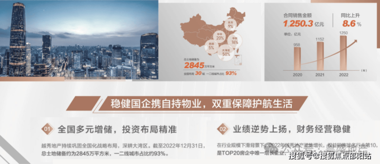 【2022年销售额1250.3亿,蝉联广州TOP1;2023年TOP20房企增长率第1,“三道红线"全部指标"绿档"达标。数据来源:克而瑞】越秀地产1983年成立,是中国第一代商品房缔造者41年长足发展,布局全国超30城,深得超100万业主的信赖