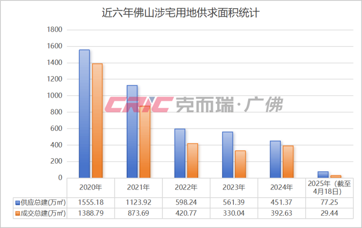 克而瑞数据监测显示,从近六年佛山涉宅用地供应情况来看,克而瑞数据监测显示,从2020年的高位时期供求超过千万方,降至2024年供求不足五百万,同比回落幅度超7成,直到目前,佛山涉宅用地供应面积77.25万㎡,成交面积29.44万㎡,回落幅度进一步明显。