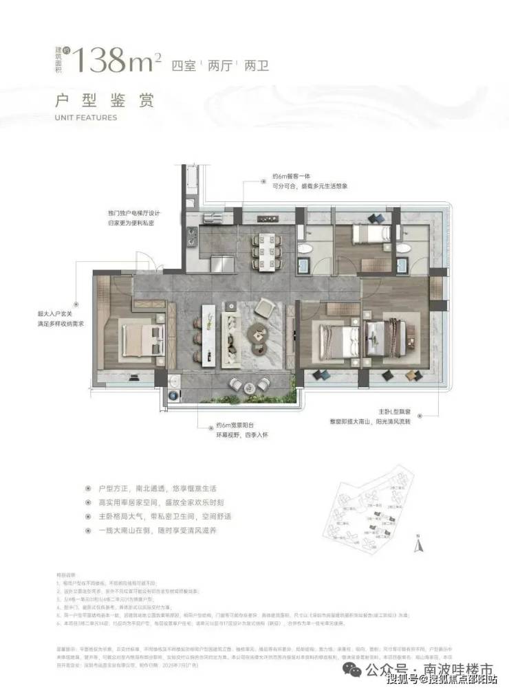 南北通透大采光:两栋板楼坐北朝南,坐拥一线大南山,一字型布局,大面宽,小进深,自然风全天循环、100%阳光健康舒居。