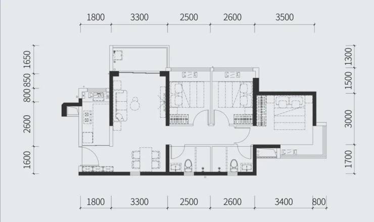 3、主卧套间设计,双床头柜+梳妆台配置;