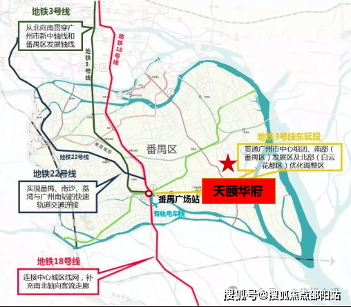 四地铁:地铁3号线,18号线(预计今年通车)、22号线(预计今年通车)、17号线(在建)番禺广场交汇站
