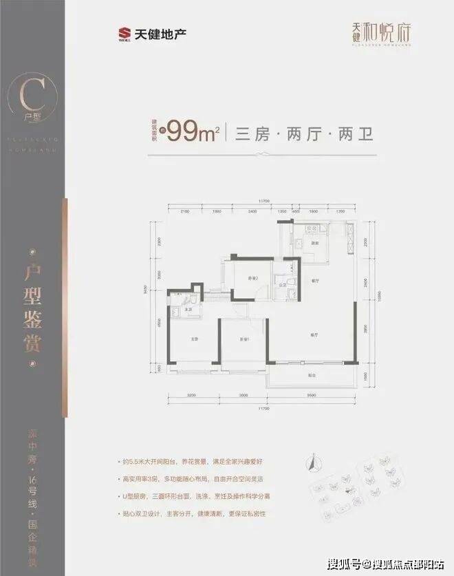 99㎡的3房2厅2卫,设计的是经典竖厅格局,可以改4房的户型,进门入户玄关,客厅实测5.25米开间,客餐厅实测19.67㎡,三开间朝南,动静分区,分别做到了主卧13.53㎡/次卧9.07㎡/次卧6.56㎡(实测面积,去掉墙体),U型厨房,公卫三段式分离,得房率81.7%(不含赠送),阳台实测5.1米长约7.15㎡西南朝向。赠送面积约9.5㎡,加上赠送后得房率约91.3%。