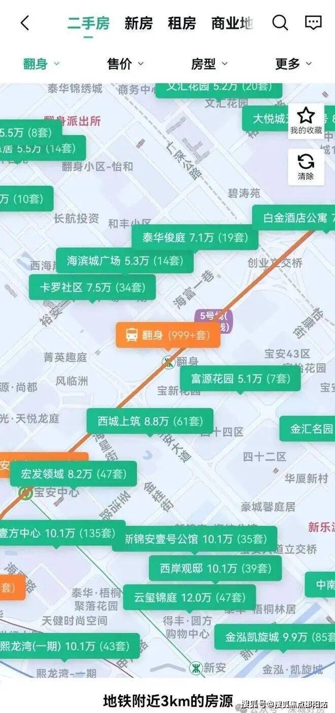 再看二手房,翻身地铁站周边二手房信息如下图,周边二手房价格差异较大,从5万-10万+不等,接近天健和郡府的二手房5万+的小区,主要是周边20年楼龄老旧小区,破旧,且居住体验较差。