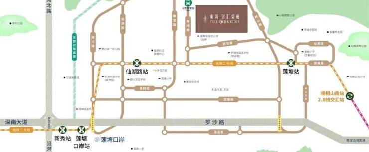 距离地铁2号线莲塘站A出口仅约500米,直达万象城、金光华等商圈,两站即达莲塘口岸。(数据来源:百度地图)