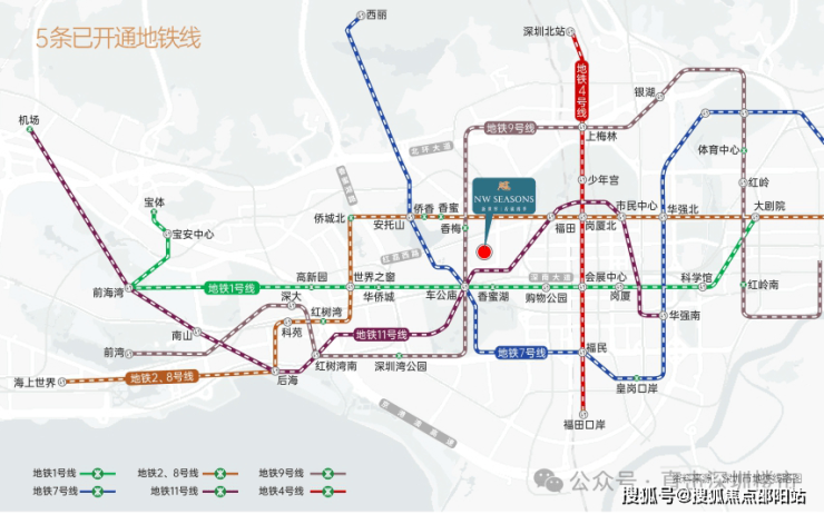交通方面:项目毗邻香蜜湖站与香梅站双地铁口,现有1、2、7、9、11五条地铁线已开通,规划新增20、22、24等多条线路,共计10线8站全维交通。南侧是贯穿深圳中心线的“第一大道”深南大道,自驾出行也十分方便。