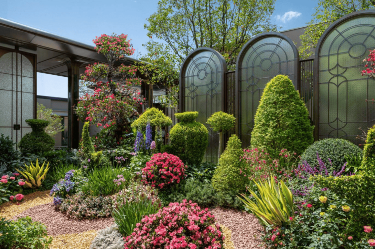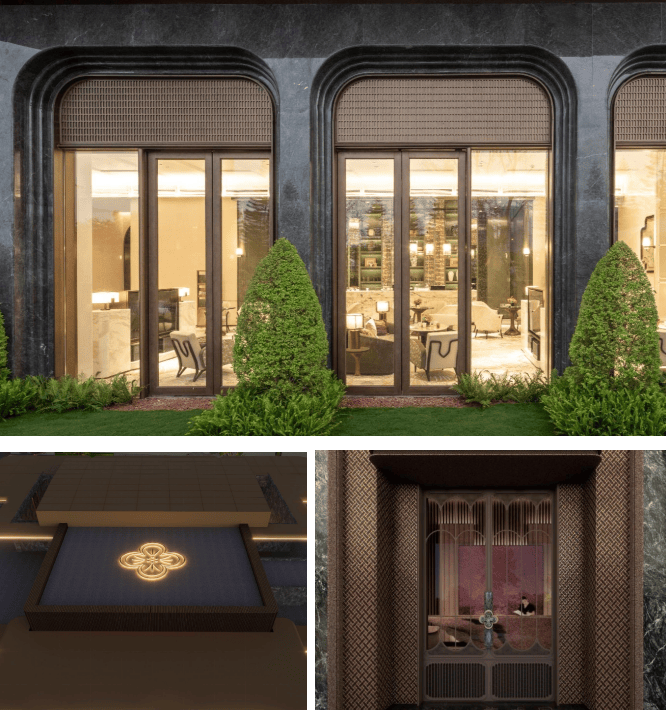 南洋风格的精髓在于永不过时的精致与风情,这条景观连廊以现代设计手法,重新诠释经典南洋风情——印度绿奢石的温润质感、复古花窗格栅的优雅光影、斜切三角铺装的几何韵律;铜质Logo镶嵌于石材之间,细节处彰显奢华;花园植物以强烈的几何秩序排列,营造典雅而灵动的空间韵律。细腻的肌理碰撞、丰富的色彩层次,让连廊不仅延续了南洋风情的热情与活力,更赋予其现代艺术氛围与度假般的松弛感。