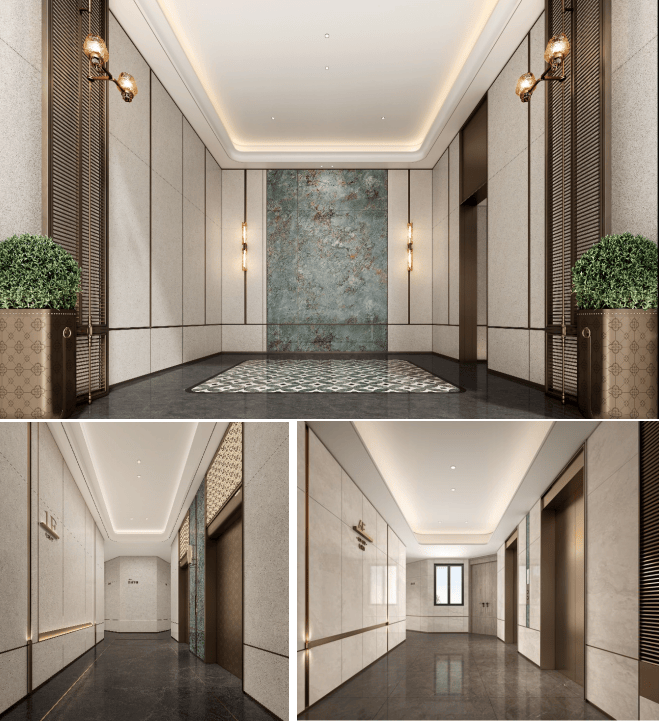 地上归家流线:街角艺术口袋公园——星光迎宾大道——滨河四季花汀——新南洋生活美学馆——风雨连廊(园林归家路)——主题架空层——单元门头——室内大堂——首层电梯厅——标准层电梯厅;