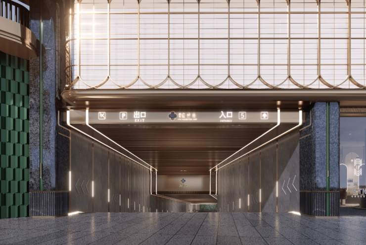 商业立面提取本地建筑中山大学怀士堂的形象意蕴与色彩肌理,整列式的壁柱复刻出广式骑楼的形态,砖红与复古绿的釉面陶板立面展现出岭南地区多样的建筑色彩。通过商业飘檐的连贯变化,丰富沿街近人尺度的立面节奏,营造“檐下”休憩、生活的温馨感受,同时隔绝塔楼的压迫感。展现出一种协调融洽、大气高级的创新商业格调。