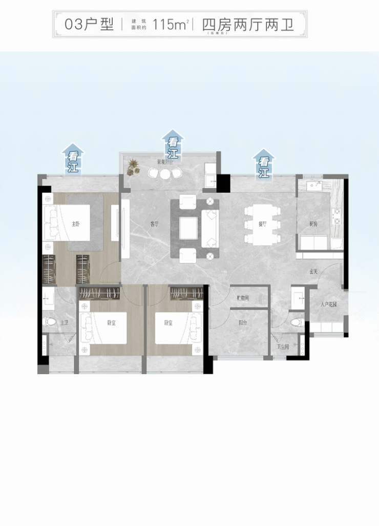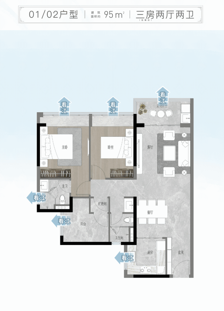 :纯南向设计,采光极佳 。主卧带套间,保障主人私密性 。厨房 U 型设计,洗切煮动线流畅 。餐客厅到阳台空间连贯,适合新婚家庭或小太阳家庭过渡 。从客厅阳台到主卧阳台可观江景,部分西向小次卧也能欣赏江景,性价比高 。