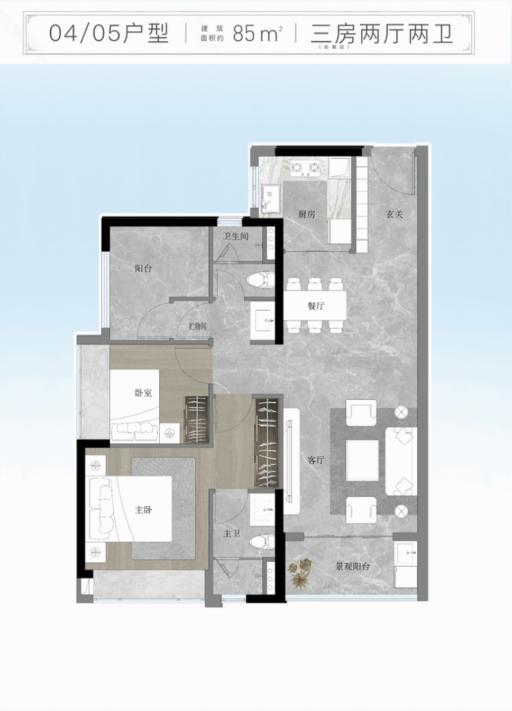 :控制总价同时满足二孩家庭需求 。横厅设计,零过道不浪费空间,横向景观从餐厅横跨至客厅,视野开阔 。