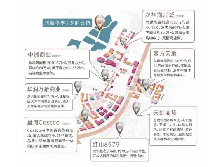 周边深圳最大型商业壹方天地、华南地区Costco(在建中)、红山6979、天虹商场等