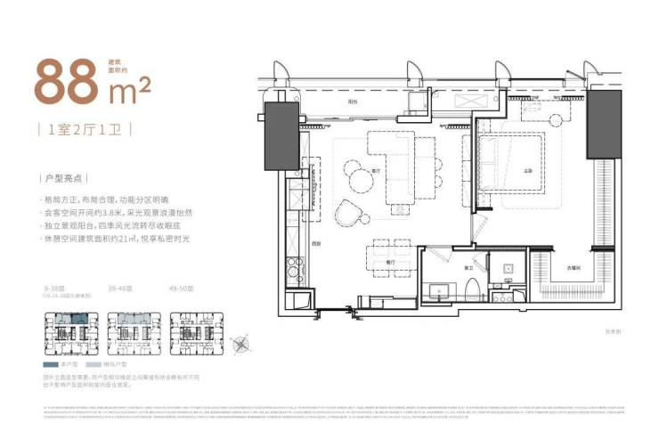 总楼层:50层,低区9-38层,高区39-48层,顶层49-50层
