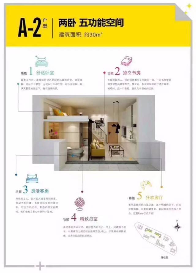 A-1户型品鉴:3.6米层高,单面采光,上下分层布局合理,收纳、起居、空间相对独立。较高的采光高度,足以满足室内自然光线的明亮,小阳台也可完全满足日常外界接触空间和晾晒的需求。