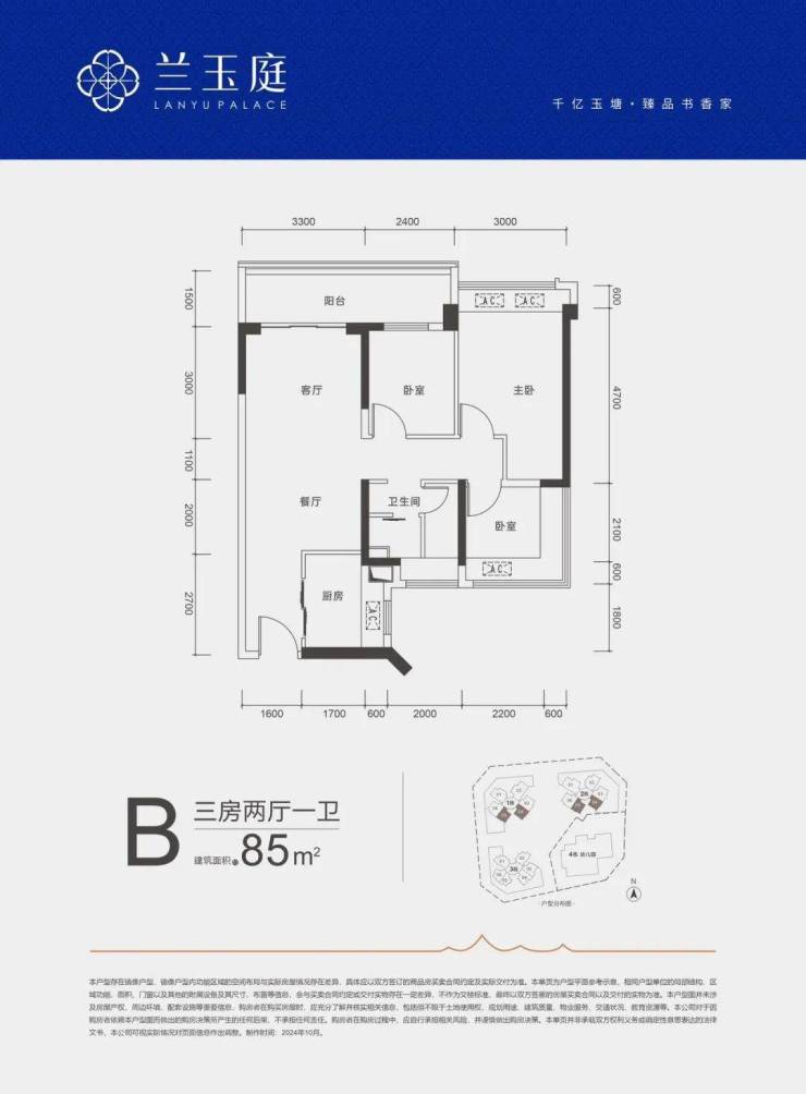 85㎡的3房2厅1卫,B户型,设计的是竖厅格局,客厅开间3.3米,LDKB一体化,三开间朝南,客厅连接次卧出5.7米长的大阳台,L型厨房,创新式三分离卫生间,得房率:79.8%(不含赠送),西南或东南朝向。套内面积67.85㎡+赠送面积11.29㎡=实用79.14㎡,实际得房率93.07%。
