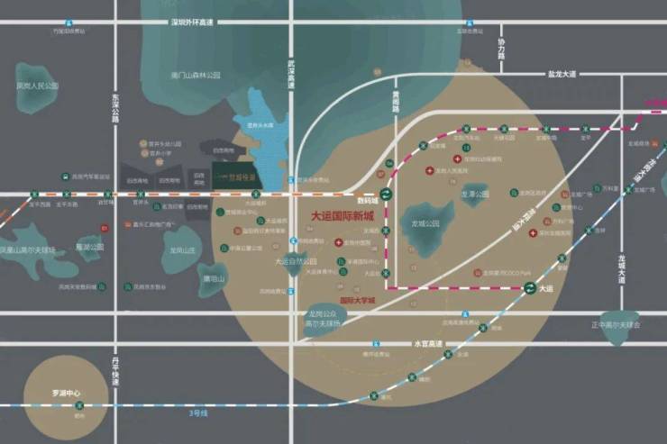 「世城悦湖」快速接驳城市交通大动脉,汇聚3大轨道、3大高速、2大枢纽、2大主干道,瞬达大湾区各大核心区域,坐享约“8分钟”双城生活圈。3大轨道:深圳地铁10号东延段大运城邦站(规划),深圳16号线天安数码城站(在建)、深惠城轨大运北站(规划);3大高速:水官高速、武深高速、深圳外环高速环伺,快速畅达深圳中心区和湾区城市主轴;2大枢纽:平湖TOD枢纽中心规划、大运综合交通枢纽规划,多轨交汇,实现真正的“站城一体化”;2大主干道:龙平西路、盐龙大道便捷接驳各大高速通道。公交站:大运城邦、大运城邦西 途经公交车:M360路、M361路、M589路、莞782路