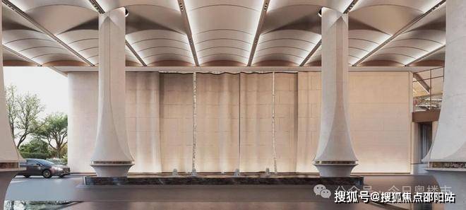 车行大门做了殿堂级落客区,设有天幕和水景,非常具备归家仪式感。每栋设有独立入户大堂,风格与大门相呼应。