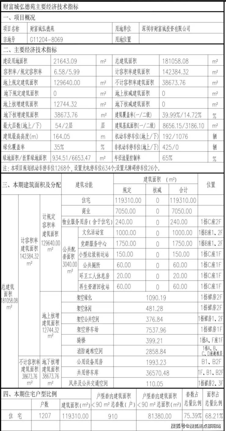 总规划1207户,其中户型套内建筑面积<90㎡的有910户,停车位1268个其中机动车位1076个,非机动车位425个