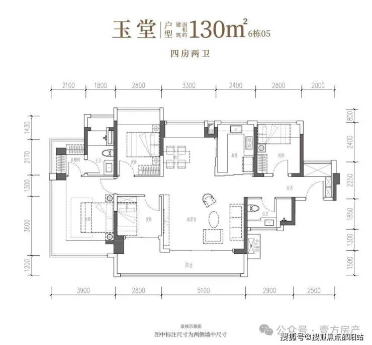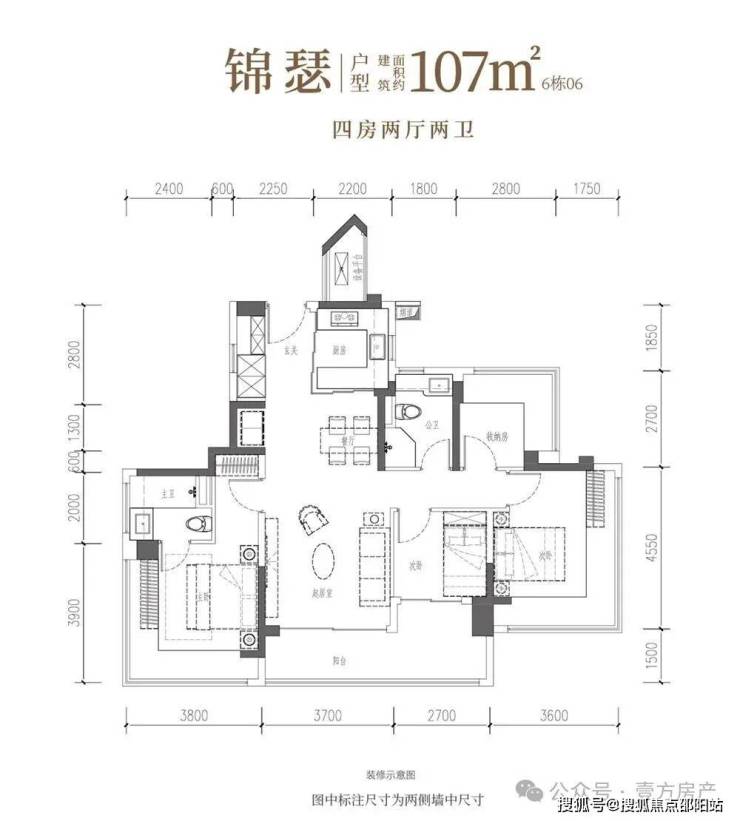 此套107㎡住宅,规划为4房2厅2卫格局,优势显著: