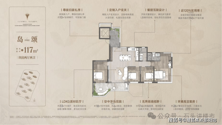 四代洋房·奢享写意人生 | 双入户大堂、一梯一户,稀缺130%实用率(不含电梯厅),6面朝南,270°环幕采光,定制约6m错层空中浮岛,奢享墅质生活